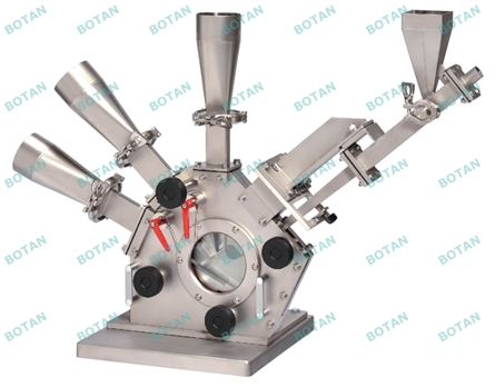 依據(jù)上述原則,對粉體的分散采用高速的引射噴嘴將粉 料引射入分級機中,利用高速氣流對粉體的剪切作用,使粉體分散成原級顆粒。此外為使分級后的超細(xì)粉達(dá)到較高的分級精度,采用射流附壁效應(yīng)與離心力、慣性力、多級分選組合的途徑。